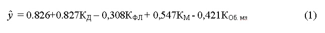 Данная модель, построенная с помощью метода наименьших квадратов на основе выборки финансовых показателей за ряд отчетных периодов, прошла три стадии проверки: на тесноту связей между показателями, на значимость показателей и на адекватность самой модели. В результате незначимые, например, коэффициент реальной стоимости имущества производственного назначения, и загружающие анализ показатели были исключены из нее.